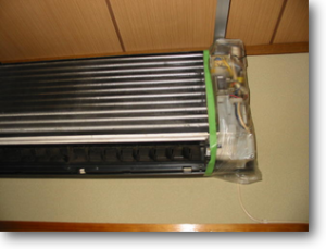 ・エアコンの内部を洗浄します。この時に洗浄液で室内が汚れないようエアコンにビニルカバーをして作業します。